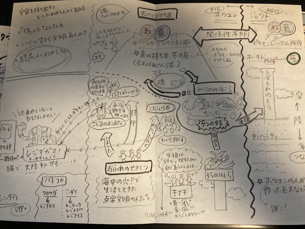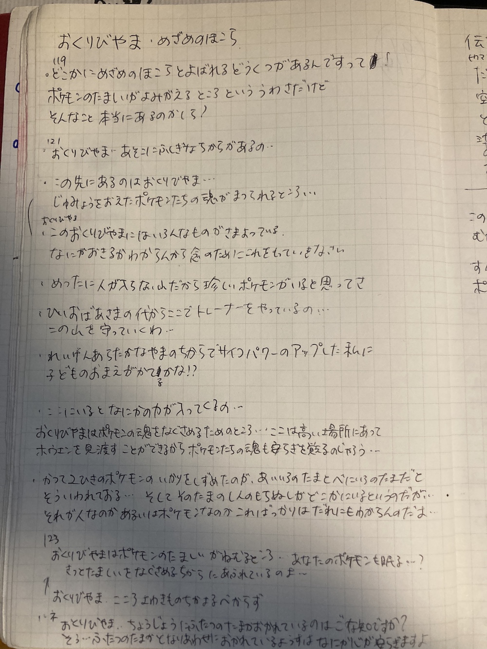 スペース用の資料 pkmn 2021年11月21日 ・この先にあるのは おくりびやま じゅみょうを終えた ポケモンたちの魂が祀られるところ・・・ ・おくりびやま桟橋・・・長い間使われていないのか 文字が消えそうになっている ・おくりびやま 頂上に二つの弾が置かれているのはご存じですか ▼はい そう・・・二つのたまが隣り合わせに置かれている様子は 何か心が安らぎますよ・・・ ▼ルネと外の世界を繋ぐ洞窟 まるで何かをここから出さないように作られたみたいだわ・・・ ・・・考えすぎかしら? ▼海底にあった火山が噴火して海の上まで盛り上がる そして噴火口に雨がたまってできたのがこのルネシティなんだよ ▼このルネシティとおくりびやまは何か の関係があるらしい・・・ 昔いた研究所でそんなことを友達と調べていたよ (お兄ちゃん 昔 海の研究をしてたんだ) ▼全ての始まりは目覚めのほこら 全ての終わりはおくりびやま・・・ ポケモンも人もどこからきてどこへいくのでしょう・・・ ▼火山の火口という輪っかに囲まれた丸い夜空 その中ではたくさんの星が生きているみたいに瞬くの・・・ 私が一番好きな景色 ▼どんな時でもどんなことがあっても あたし ポケモンと友達でいるわ だって ポケモンと一緒だとすごく楽しいもの! ▼船の旅もいいけどな ポケモンと共に波乗りで海を渡るのはなんとも言えない 気持ちよさがあるよな・・・ そう思わないか?若者よ PR